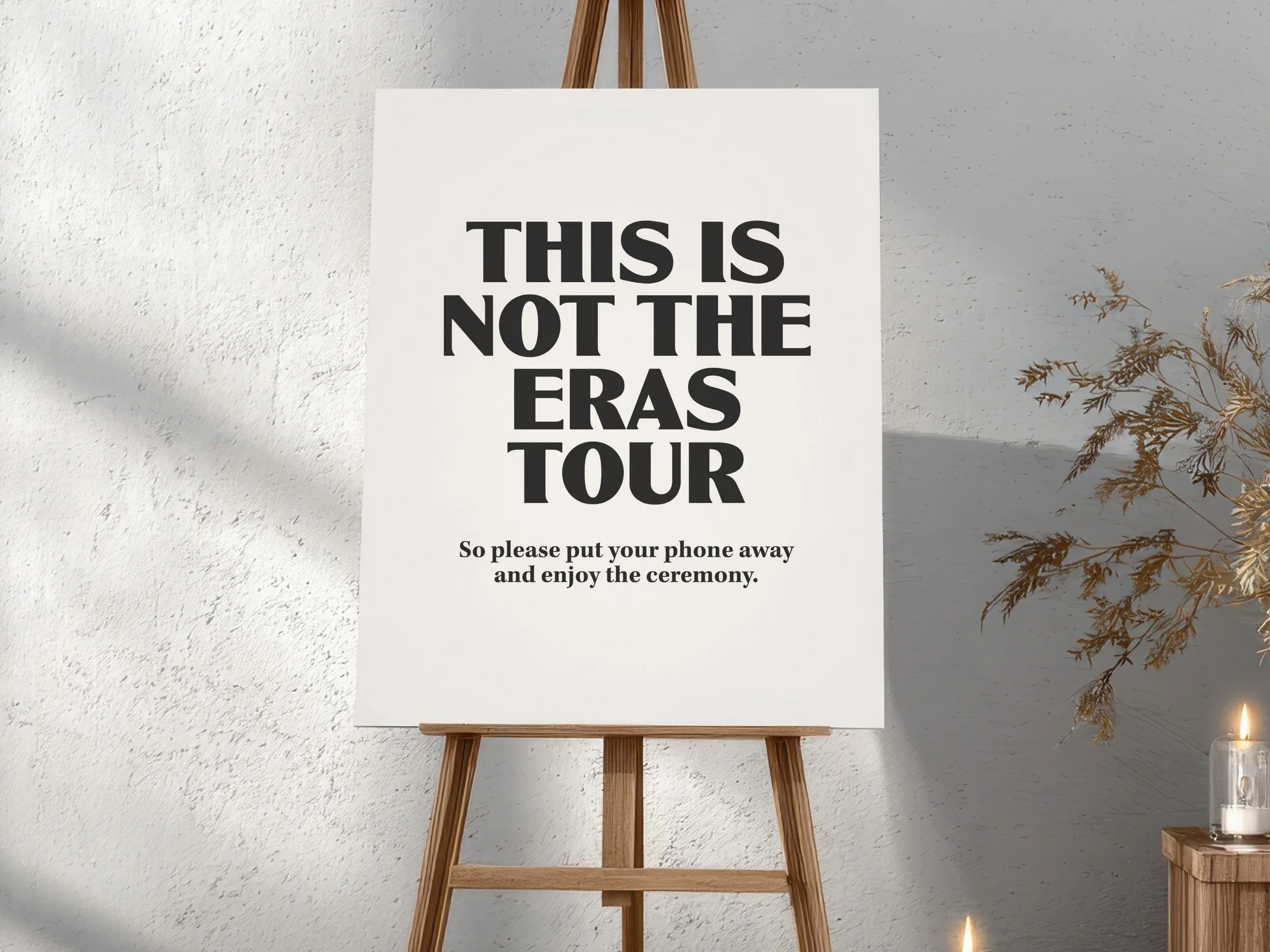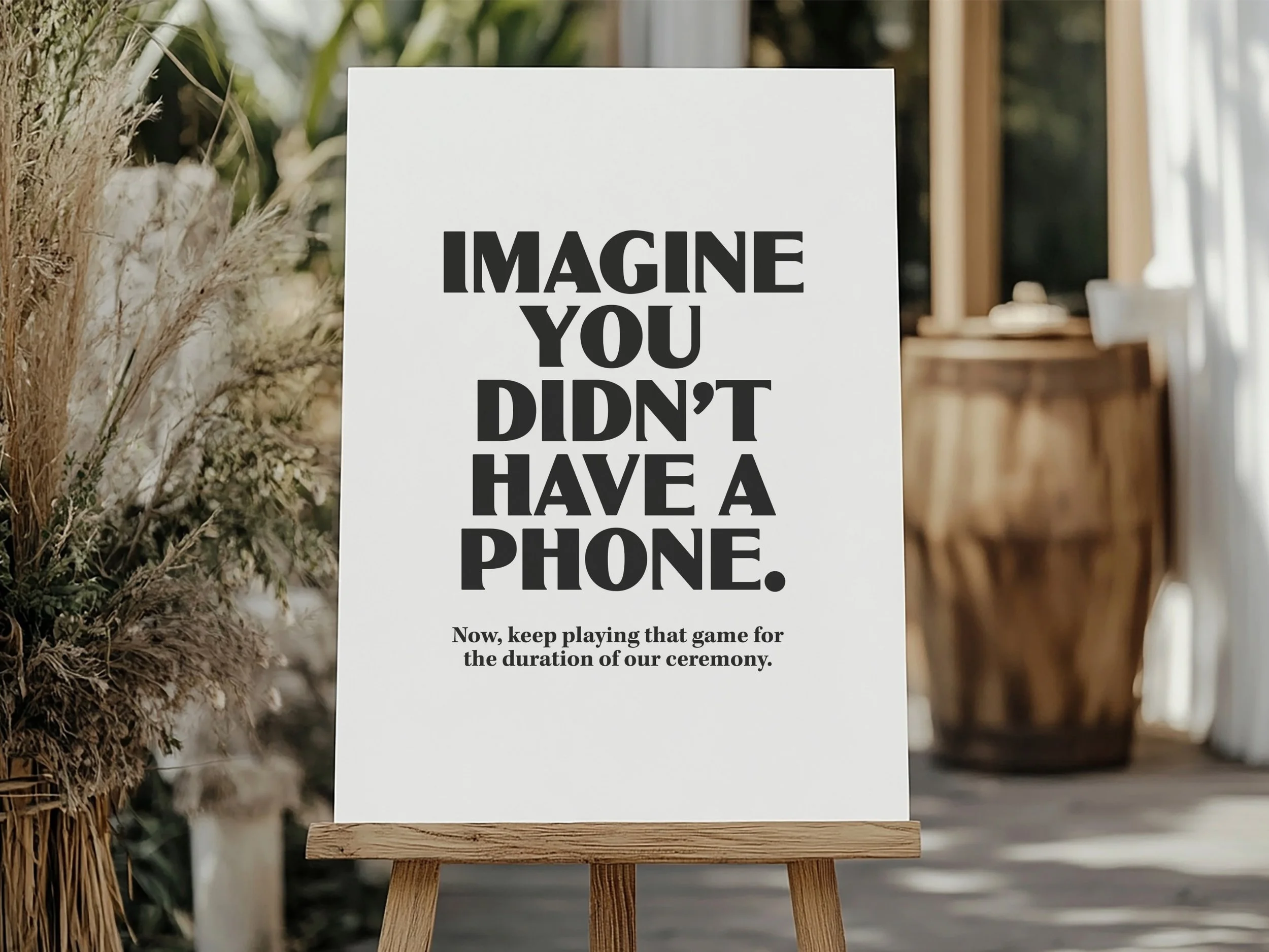 Nooooooo. A nice, pleasant sign that gently asks people to put their phones away. Something along the lines of “Kindly turn off all phones and cameras and enjoy this moment with us” or “We want to see your smiling faces not your phones.” Or you can have fun with it by turning it into a bit of a joke, like these signs from our friends at Cló Design Co.
